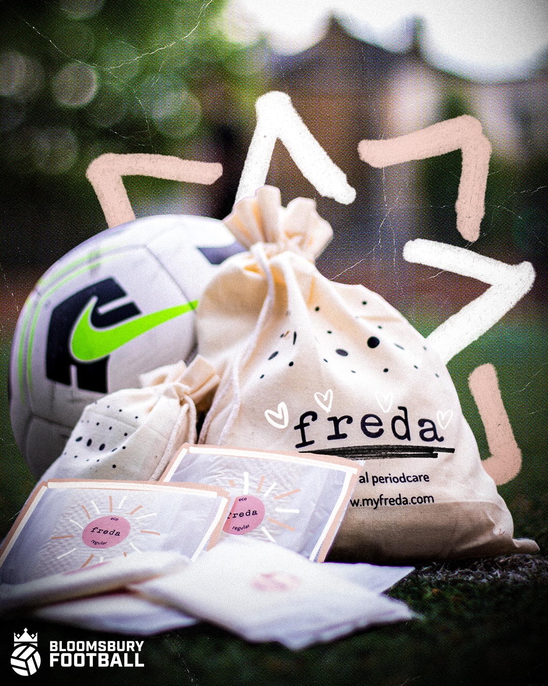 Freda is a period care subscription service with a difference. Seeing refugees stuck in temporary camps and border crossings across Europe, Freda’s founder Affi Parvizi-Wayne started to research the practical elements of displacement for women’s health. She found that many of these women did not have access to period products, as they were not included in the relief kits provided by the UN and other organisations. The shame, stigma and simple lack of awareness around periods were stopping those with periods from gaining access to these essential items. Freda was created, and it now gives back to causes such as Bloody Good Period and challenges societal norms, such as with this new partnership with Bloomsbury Football.